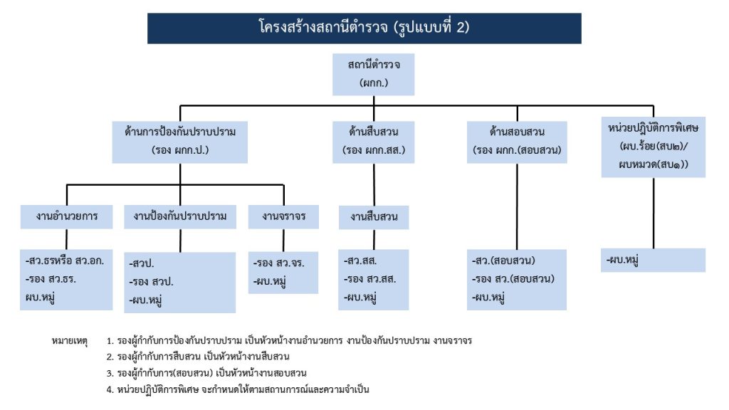 1. งานอำนวยการ มีหน้าที่เกี่ยวกับการอำนวยการ การวางแผน การตรวจสอบติดตามและประเมินผลงานที่เกี่ยวกับนโยบาย ยุทธศาสตร์ และแผนงานของสถานีตำรวจ งานการบริหารบุคลากร งานจเรตำรวจ งานกิจการพิเศษ งานความมั่นคง การศึกษาการฝึกอบรม งานวิชาการ สวัสดิการ การพัฒนา การบริหารจัดการ งบประมาณ การเงิน การพัสดุ การพลาธิการและ สรรพวุธ การส่งกำลังบำรุง รวมทั้งลักษณะงานอื่นๆ ที่เกี่ยวข้องหรือเป็นส่วนประกอบของงานดังกล่าว เพื่อส่งเสริมหรือสนับสนุนการปฏิบัติงานของสถานีตำรวจ